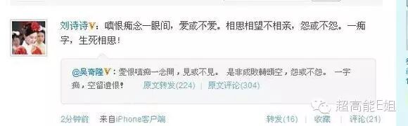 吴奇隆关于刘诗诗的第一条微博竟然是调侃她的旗头