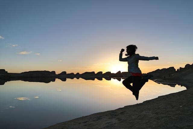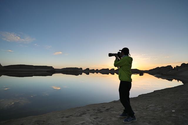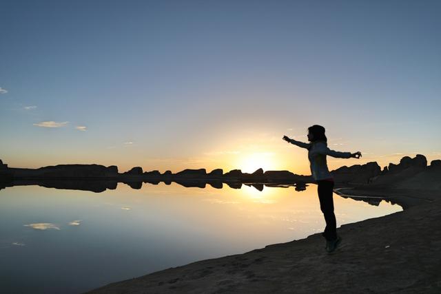我们一行人中,大家在光影渐渐的变化之中,站在雅丹群里,水畔,夕阳下,姿势各异。