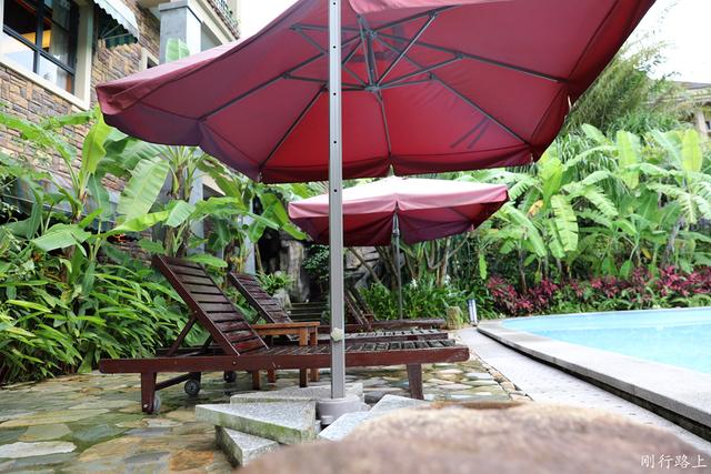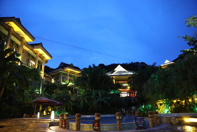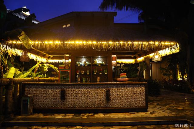 这是夜晚的呀诺达雨林一号度假酒店,原本是坐在院子里聊天的,突然间伴随着夜幕渐渐降临,原来灯光中的雨林之夜会这么美,一角的泳池吧四周盖着的茅草都仿佛发出了淡淡的光晕。