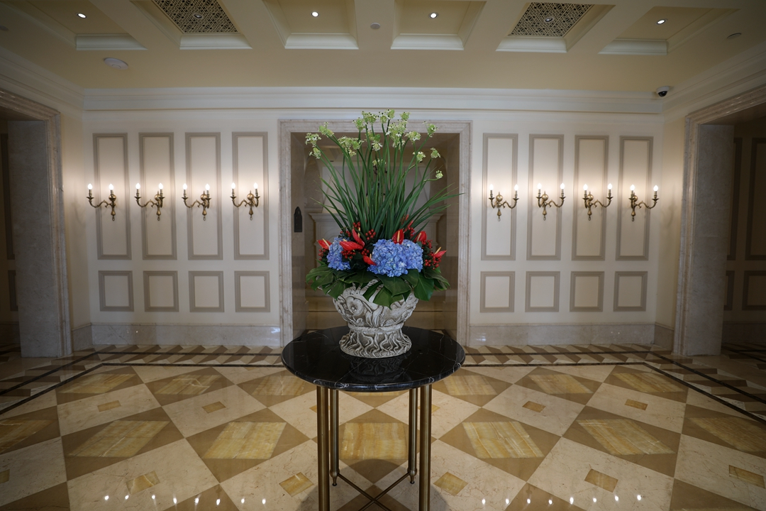 酒店以拉斯维加斯的The Mansion at MGM Grand为原型精典打造,一幢 6 层楼高的主建筑,融合了美式风格及中国传统元素,从而也形成了特有的豪华气质。酒店管理方ClubCorp,是一家汇聚了众多顶级俱乐部的企业,因此在这里从开始抵达,到入住几乎都享受到了会员般贴心的照顾,大堂虽然空间不大,但是布置的十分温馨。大堂提供的冰爽柠檬茶,瞬间消除了沿路而来的疲惫,而精致的四周环境,与杭州历史关于的文化陈设,都在点滴之间处处展示在这里。