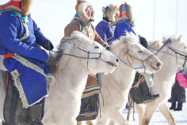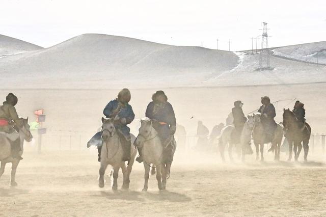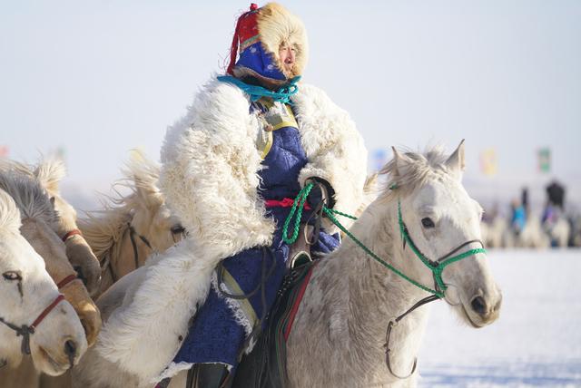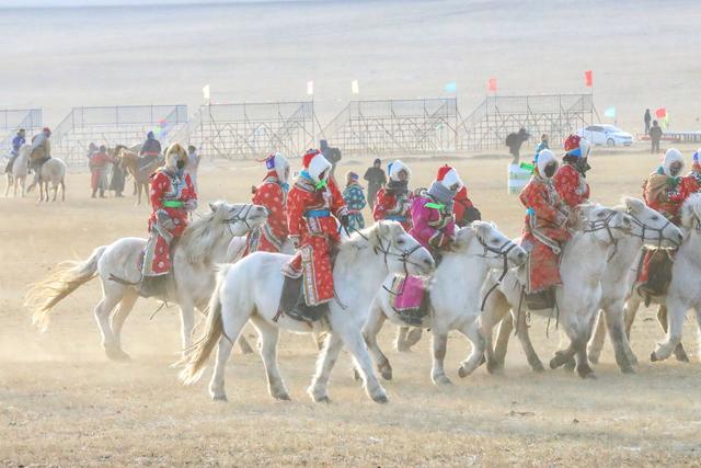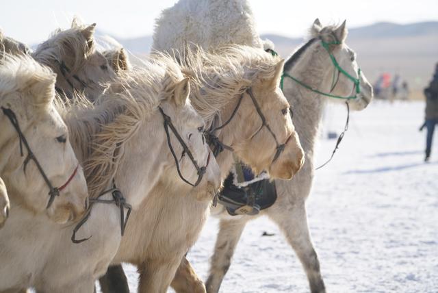 当我们在乌珠穆沁冰雪那达慕现场看到冬日里的白马时,白雪与白马综合交融在一起,灰色的草原,白色积雪,白色马,颜色各异的骑马人,又是另外一副画面。