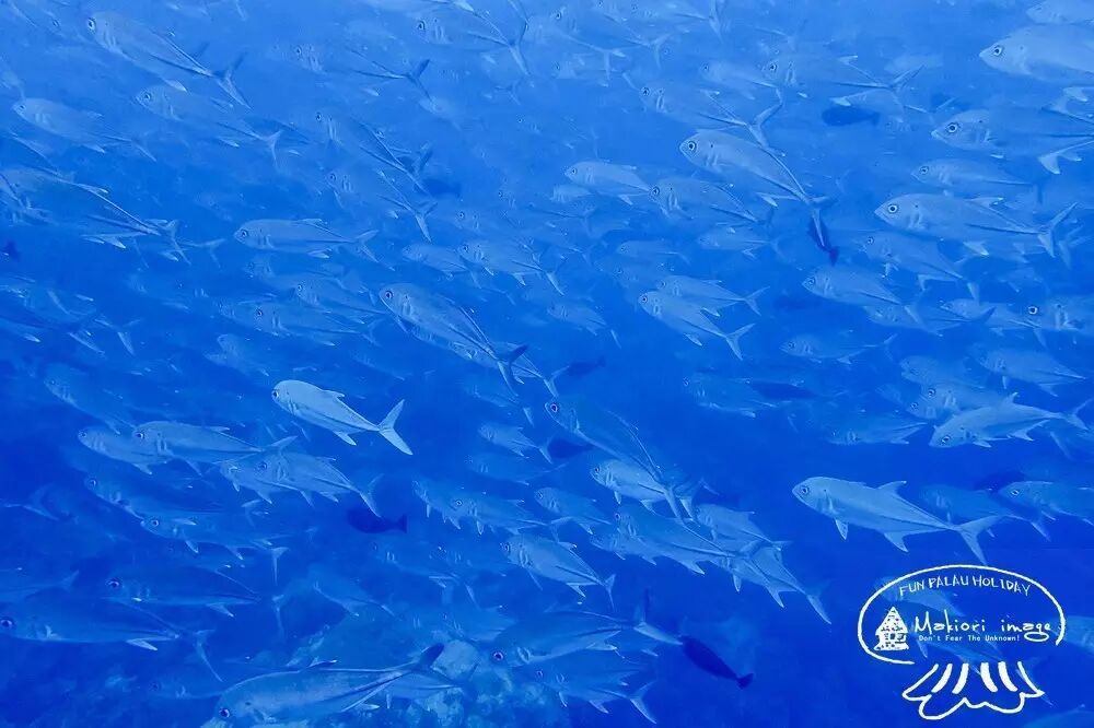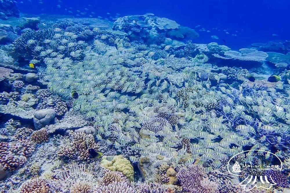 这个区域里长满了茂密的软硬珊瑚,无数的七彩鱼就在这一座广大的珊瑚花园里嬉戏游玩,几乎帕劳80%的品种,都能在这里看见。你还会感受到一件非常有意思的事情,就是这里的水温会左边热右边冷,浅滩区域的水是热的,而深水区域是冷的,这种感受在交界处非常的明显。