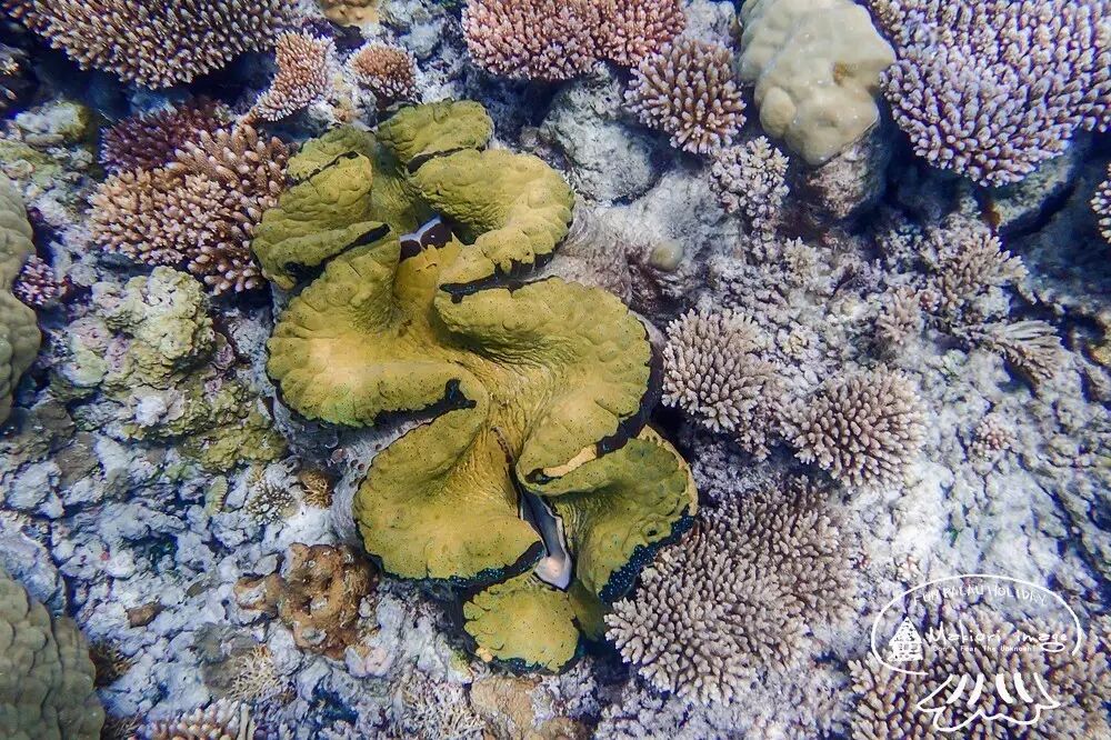 这里也发现了一只很大的砗磲贝,我靠近的时候它会闭上呢。据说,这种贝壳的肉质比较的鲜美,只不过我没吃过所以只能留到下次啦。