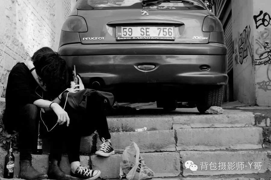 斜阳投在碎石板小道,紧紧相拥的情侣,脚边的空酒瓶似乎有几分无奈