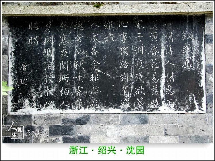 在浙江的绍兴,有一座沈园。南宋时期那里叫做山阴。传说从前沈园的粉壁上曾题着两阙《钗头凤》,据说第一阙是诗词名家陆游所写,第二阙是陆游的前妻唐婉所和。这两阙词虽然出自不同的人之手,却浸润着同样的情怨和无奈,因为它们共同诉说着一个凄婉的爱情故事—唐婉与陆游沈园情梦。