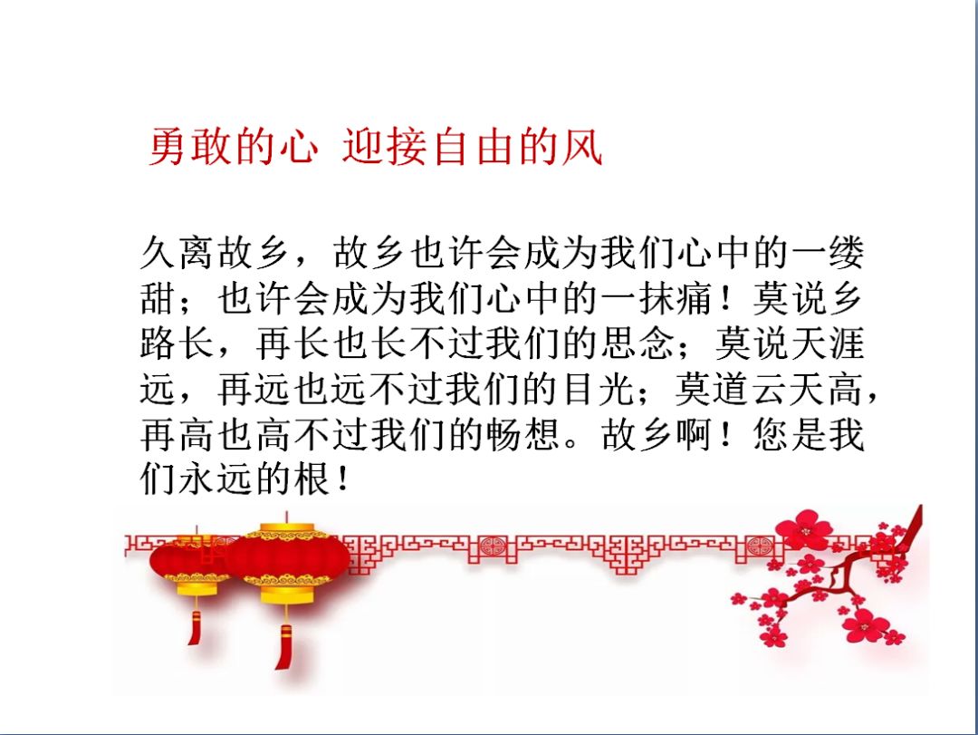 师:每次在心底,轻启“故乡”一词,眼睛总会莫名其妙的潮湿。异乡永远那么远,清香的乡愁却永远那么近。懂得了乡愁的人,便懂得了人生的况味,也懂得了父母的恩情,更懂得了幸福的温度。