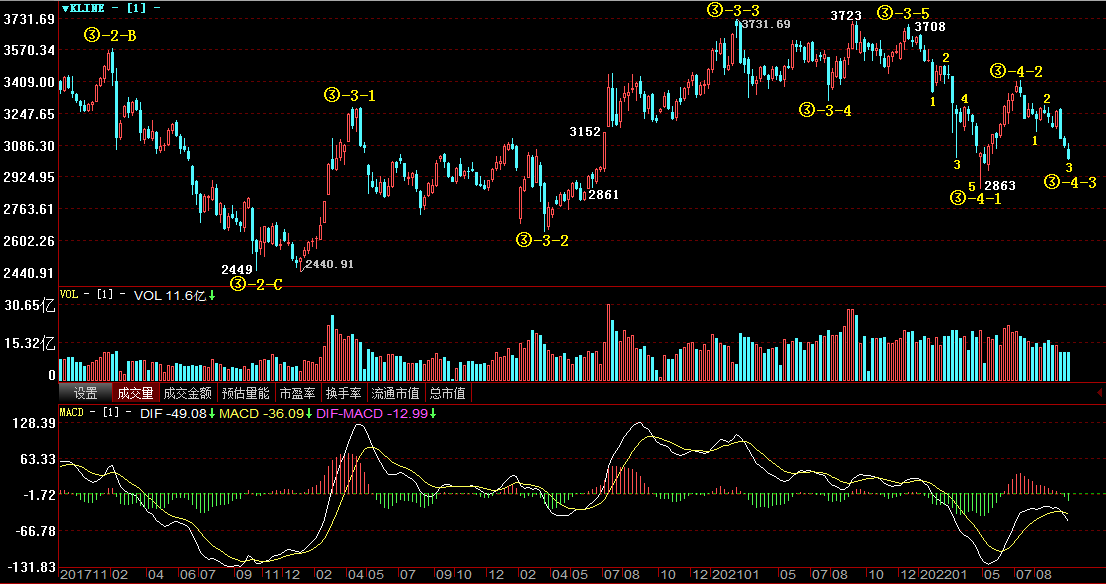 3708之后已是超3-4熊市的步调,对子浪重新进行标注,3708~2863为超3-4-1,内含5个2级子浪共19周