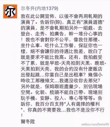 2014年,尔冬升在朋友圈里炮轰有些演员轧戏,直斥某些演员“没有道德”,这件事情又马上在微博上开始发酵。网友纷纷猜测,这可能暗指当时尔冬升新版《三少爷的剑》计划演员“彭于晏、杨颖及林更新”中的某一位。尽管当事人后来都已经理清了关系,但是导演爱放炮的个性,又一次得到了彰显。