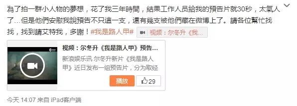 这一次《我是路人甲》也是他自己出钱,尔冬升自己的电影公司“无限映画”投资拍摄,据说,这么一个小片,整个制作预算已经跟《窃听风云3》不相上下了。从预告片里也能看出来,片子里的大场面不算少,只不过主战场从台前变成了幕后。