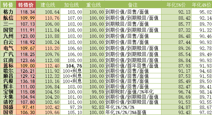 比如万众瞩目的重工转债,一般先放最普遍的“到期安全价”、“回售”、“面值”三个价格。计算一下,分别为建仓线109.6元、加仓线=100+当年利息1%=101元、重仓线100元。