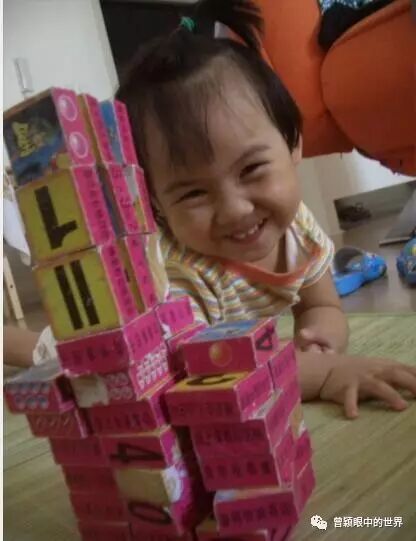 垒好一个积木,就像建好一幢房子,马上喊爸爸来照相留念。
