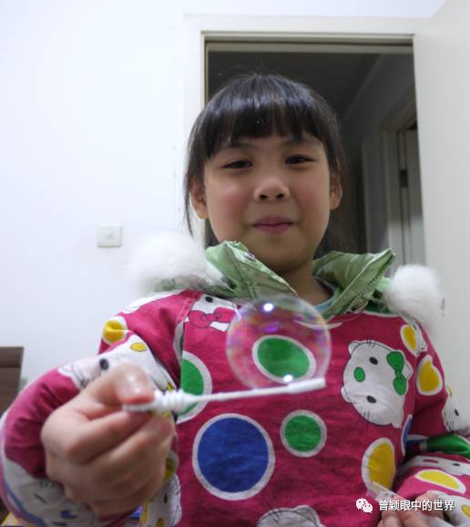 八九岁时在家玩泡泡,很嗨的样子。