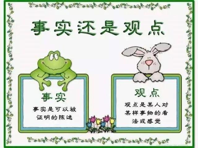 是的,她说。她说那堂课是讲的关于什么是事实,什么是观点的问题。这个问题,我们直到大学也没有人在课堂上专门给我们讲过。听起来好像是顶不重要顶不重要的问题。但在国外的学校,这是一个从小学开始就必须掌握的一个规律性的东西,即:观点是带有主观色彩和价值判断的一种情绪表达,而事实却是事物的客观呈现。比如一杯水,用温度计测量,它的温度是45度,这就是事实。而你觉得它是冷还是烫,就是观点了。而观点,往往跟自己喝水的习惯有关。这里最关键的元素,是“觉得”,而感觉往往是因人而异的。