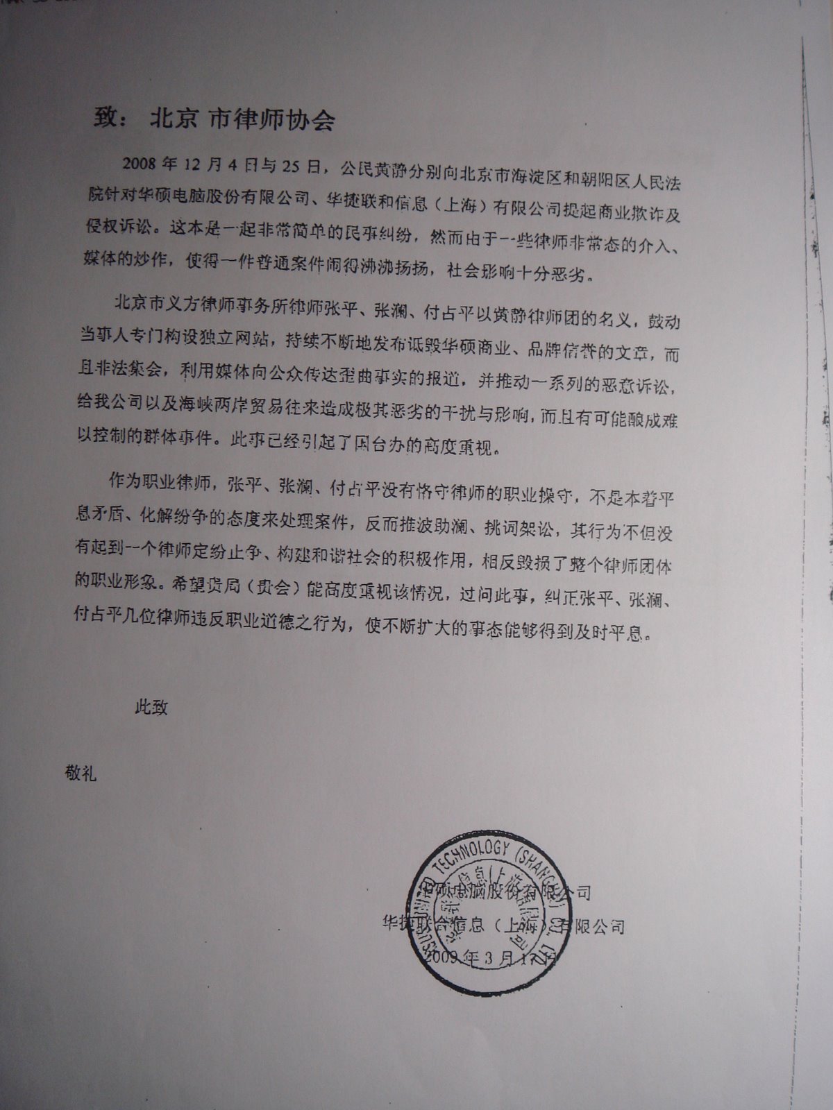 看到朋友发来华硕向北京律师协会投诉黄静律师团律师的投诉信,倒有些不懂,如果说黄静律师团搞非法聚会,那参加发布会的媒体记者便违反了法律,单单 一个黄静起诉华硕案件又如何影响了海峡两岸的贸易往来?作为一个律师不为自己的代理人依法谋取最大利益,难道其首要职责是定纷止争、构建和谐社会?