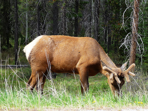 各种野生动物像北美红鹿(英文Elk)、小鹿、山羊、驼鹿、大角野绵羊、亚洲黑熊、美洲黑熊、海狸、落基山鼠兔、土拨鼠和驯鹿数量众多。下面这个elk的身上的毛还没褪尽,角是新长出的,以后会越长越大,非常漂亮,现在么,其实就是鹿茸啦。想起来这味药材挺残忍的。