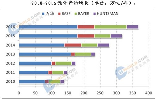 目前中国已投产的MDI装置集中在中国东部山东烟台和上海、浙江。万华已将根据地山东转至宁波大榭岛,一方面是配合产能增加需要,另一方面拓展地理层面上的供应优化,通过新生产基地来增强华东和华南地区的供应,扩大客户群,由此可见万华与BAYER、BASF等外企的正面竞争将越发激烈。
