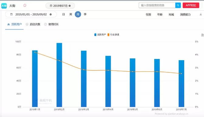 根据易观千帆的数据显示,截止今年7月份大街网app的月活用户仅有71.74万人,其整体月活用户数量从今年2月就开始不断下滑。