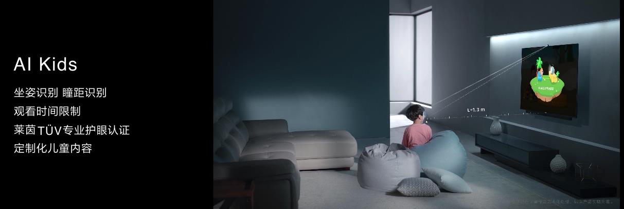 还有一个就是AI Kids,即儿童模式。作为家长,最发愁的就是孩子看电视离得太近、长时间看电视。现在,这些问题都可以交给AI来解决。慧眼通过智能识别,如果发现孩子观影距离过近,或者斜躺着看电视,都会发出提醒,让孩子正确观影。并且在这一模式下,设定了观看时长,时间一到就会自动提醒孩子。很多家长往往都是因为这些小事与孩子争执,现在由AI来“控制”,孩子觉得有趣,也会更加听话。