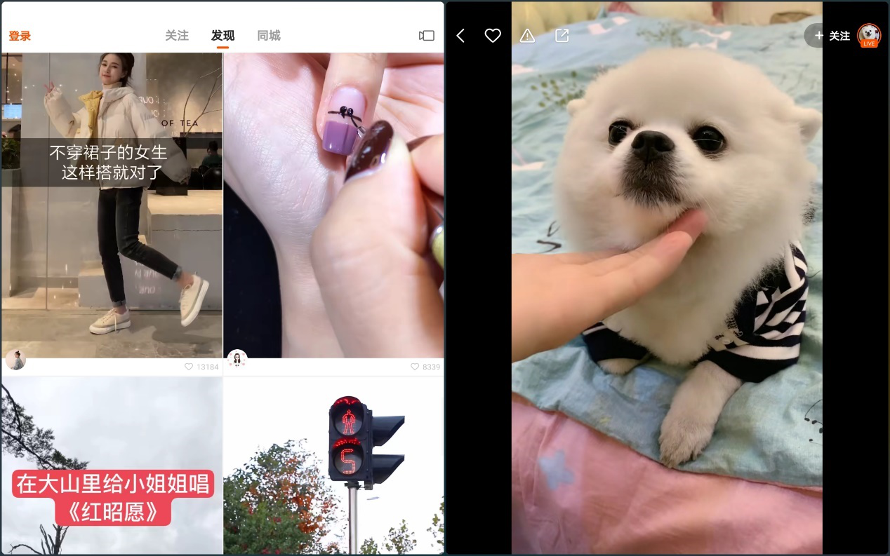 再比如年轻用户喜欢到B站看剧,他们看完剧之后往往还要去刷解说,现在可以边看片边刷解说。打开快手APP,可以看到主页推荐很多内容,点击想看的内容,左侧还是推荐页,右侧则进入到具体的视频中,可以一边看右侧视频一边再看看左侧还有什么热门推荐。