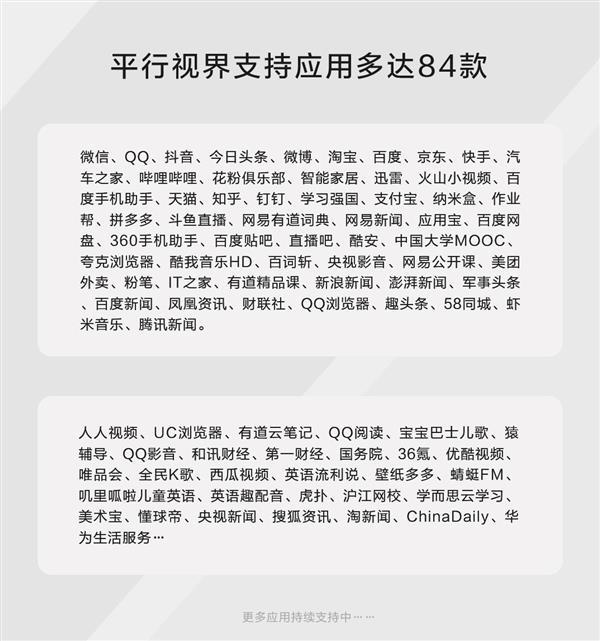据悉,从发布以来平行视界的第三方支持也逐步在扩大,华为平板M6全系升级到最新版本后,平行视界已经支持多达84款应用,预计年底支持100款。而随着正向循环的形成,必将使得平板生态更加繁荣。