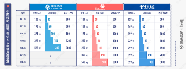 目前,中国移动发布的5G套餐资费,5G套餐最低128元/月,包括30GB流量,200分钟通话;联通发布的5G套餐,最低档每月129元,含30GB流量,500分钟通话;中国电信发布的5G套餐,最低档价格、套内流量、通话时长,均与联通一致。似乎,三家都提前商量好了吧?