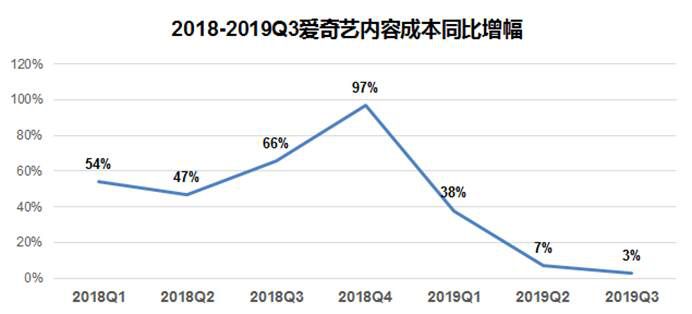 从本次财报来看,爱奇艺第三季度的内容成本为人民币62亿元(8.705亿美元),同比增幅3%,内容成本增幅从2019年Q1开始连续三个季度下降。