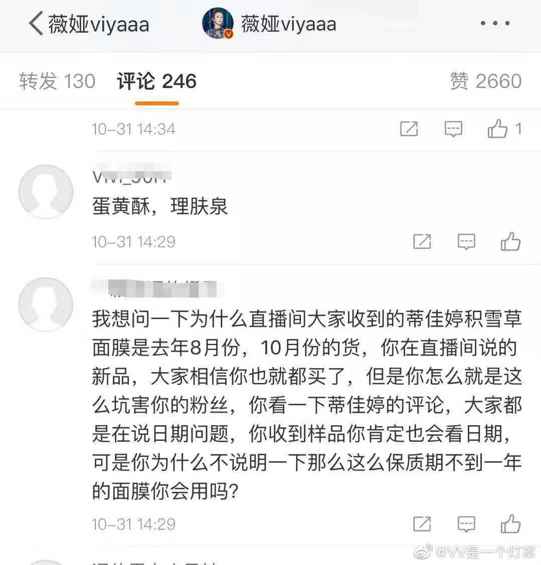 另一方面,薇娅也并不好过。不少在薇娅直播间买东西的粉丝质疑面膜临近保质期,此外,还有网友表示薇娅直播间卖的化妆品疑似假货。