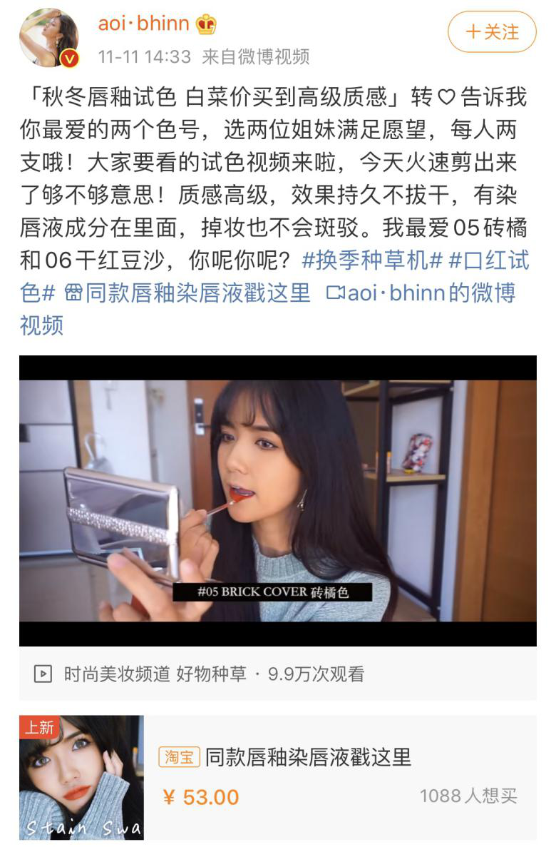 aoi.bhinn微博拥有132万粉丝,是一名美妆种草博主。对于她来说,双十一一如平常,选品、拍视频、剪辑、发视频,直播抽奖和转发微博抽奖算是最大的粉丝福利。