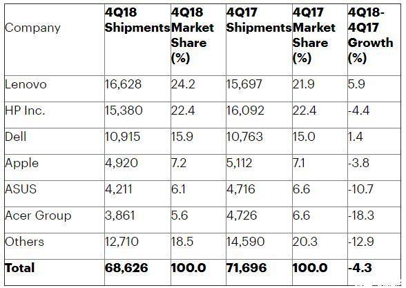 根据数据机构Gartner公布的相关数据显示,2018年全球个人电脑出货量为2.594亿台,比2017年下降1.3%。虽然相比往年的降幅,2018年的降速有所减缓,但这已经是个人电脑出货量连续第七年下降了。其中,联想、惠普、戴尔、苹果、华硕、宏碁分别占据市场出货量的前6位,排在5、6位的华硕和宏碁的整体出货量跌幅,都超过了10%。