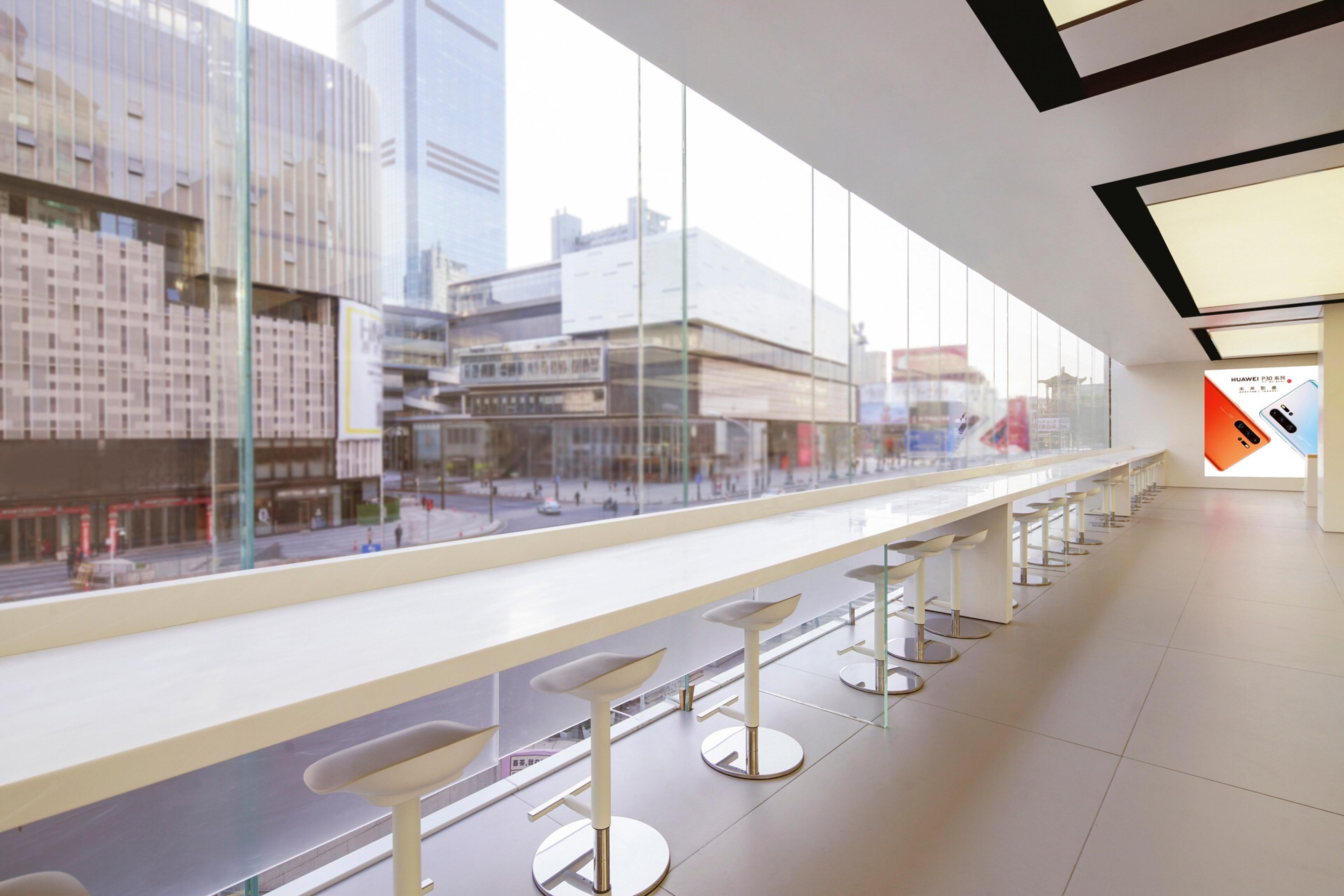 在春天百货这家店面里,二楼临窗处设置了一排长椅,是华为为消费者打造的第三空间——云吧台。消费者可以在这里停歇,享受华为科技所带来的高端体验。二楼的外立面全玻璃设计,能够让坐在这里的消费者直接看到店外的景色。这里还准备了平板,耳机和畅销书籍,让消费者可以在这里享受畅快的游戏体验,也可以坐在这里听听音乐看看书——这些都是华为云为消费者提供的服务。