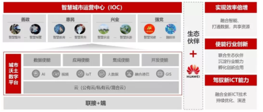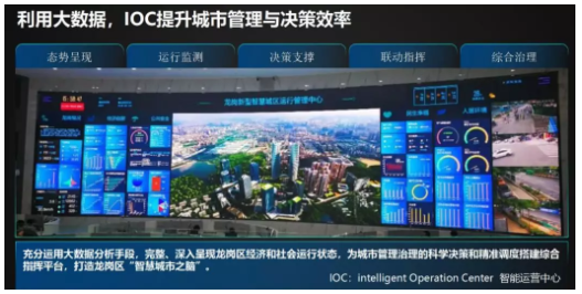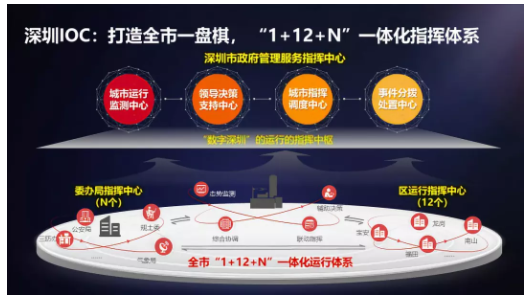 在华为等众多企业协助下,深圳市政府建设了城市智能运营中心(IOC),打通了100多类数据,28万多路视频,全市300多个GIS业务图层和80多个重要的业务系统,构建了深圳市“1+12+N”一体化指挥体系。深圳IOC是一个能看、能用、能思考的智慧城市中枢,是城市运行监测中心、领导决策支持中心、城市指挥调度中心和事件分拨处置中心。