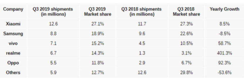 (IDC发布的2019年Q3印度智能手机出货量统计报告)