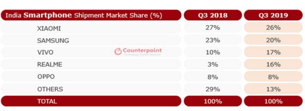 (Counterpoint Research发布的2019年Q3印度智能手机出货量报告)