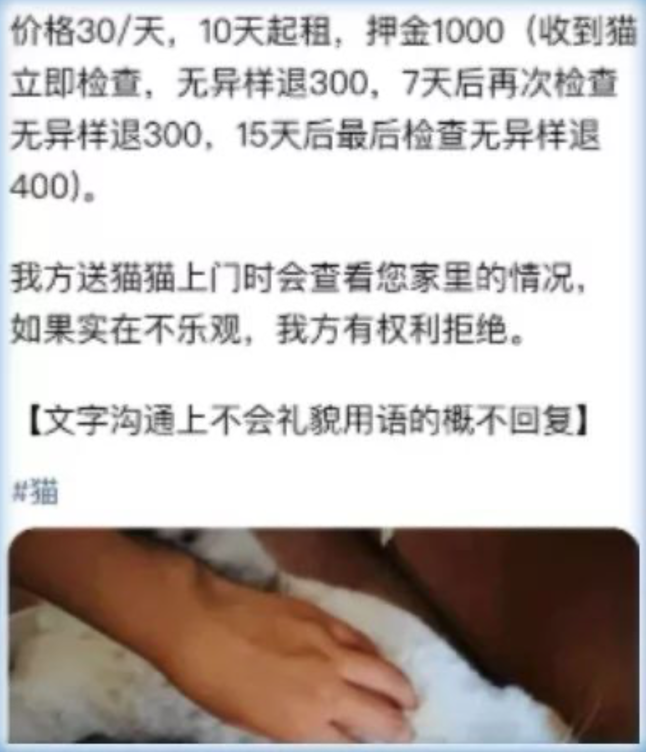 根据读者提供的线索,懂懂笔记在闲鱼上找到了一位发布租猫信息的用户。在租猫页面里,可以看到很多要求,包括租猫需经过文字、电话两轮“面试”,沟通需使用礼貌用语等“规定”。