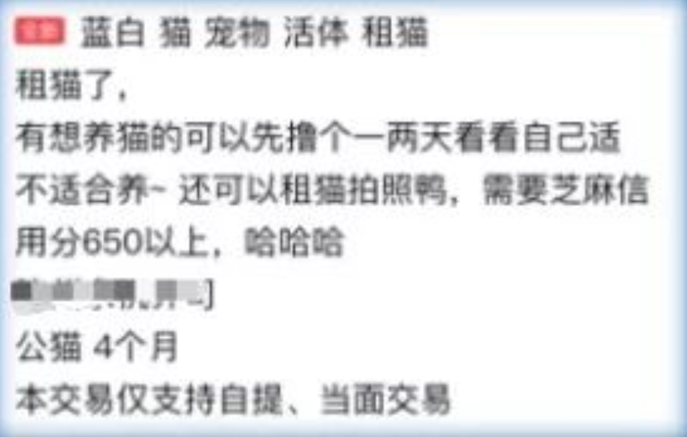 “租猫是近几个月才兴起的,都是在线上发布出租信息,同城线下领猫。”