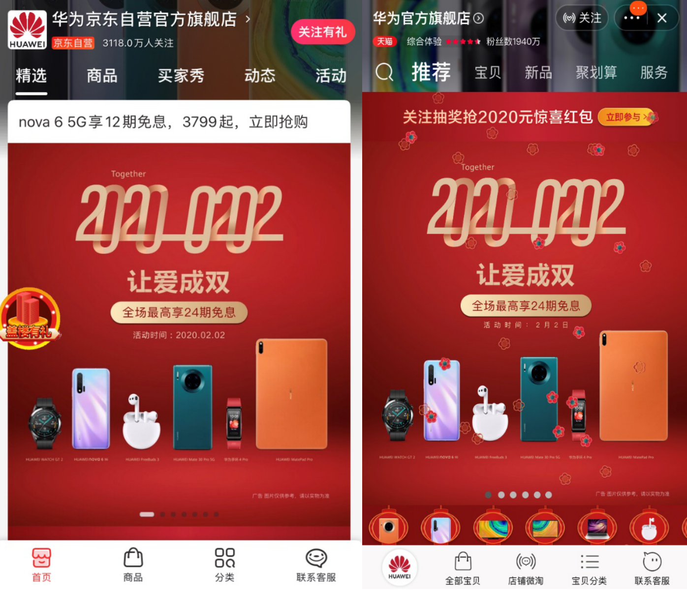 首先是线上渠道丰富,华为商城、京东、天猫、苏宁等主流线上平台全部参与,以期活动触达更多的消费者。此外,华为还准备了2020元限量表白红包、2020份精美好礼、24期免息、新春集卡赢智慧屏等众多专属福利,面向全网开放。