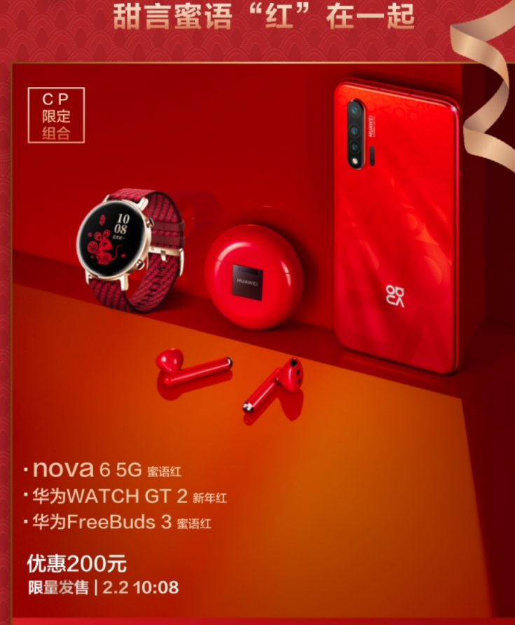红色,是春节的主色调,代表着喜庆、红红火火。为了迎合消费者节日的心情,特别推出了华为nova6 5G 蜜语红+华为WATCH GT2新年红+华为FreeBuds 3蜜语套装。