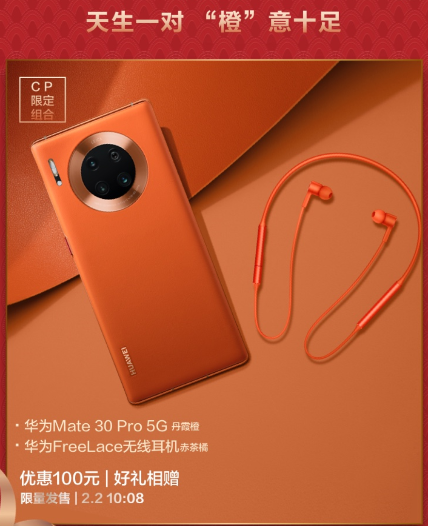 中国人讲究好彩头,“橙”与“成”谐音,中国人在节日里都喜欢以“橙”来送祝福。华为推出了华为Mate30 Pro 5G丹霞橙+华为FreeLace无线耳机套装,满足消费者对“成功”的期盼。