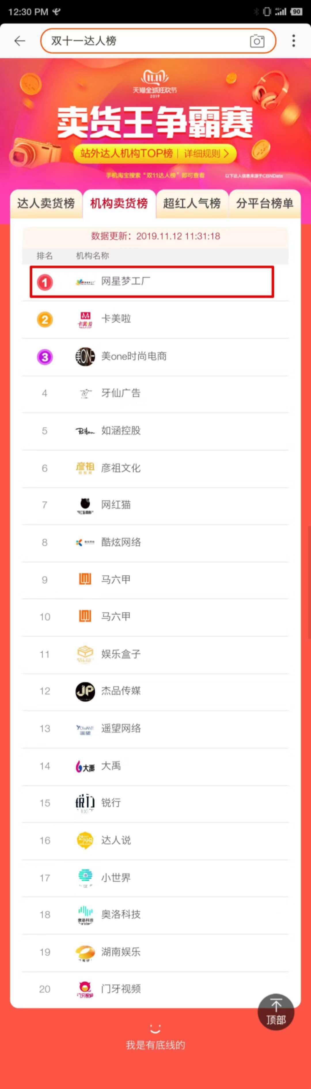 我们就以2019年双十一为例,网星梦工厂力压网红电商上市公司如涵控股、口红一哥李佳琪的美ONE时尚电商。网星梦工厂的大批腰部带货红人们,创造出每秒成交17单,每分钟成交1041单的速度,双十一全天付款订单160万笔,销售金额1.5亿的成绩单,成为当之无愧的机构带货王。