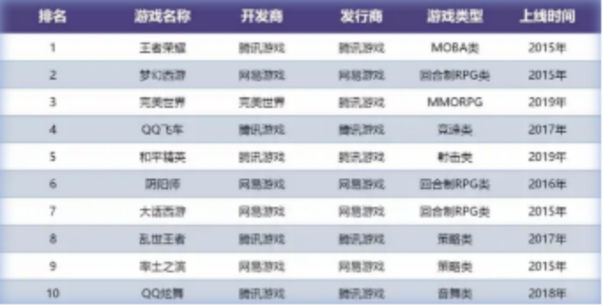 因为没有关于2019年全面的国内移动游戏收入排名,我们先从2019年上半年的相关市场数据分析:腾讯和网易共占据了90%,完美世界有一款上榜。