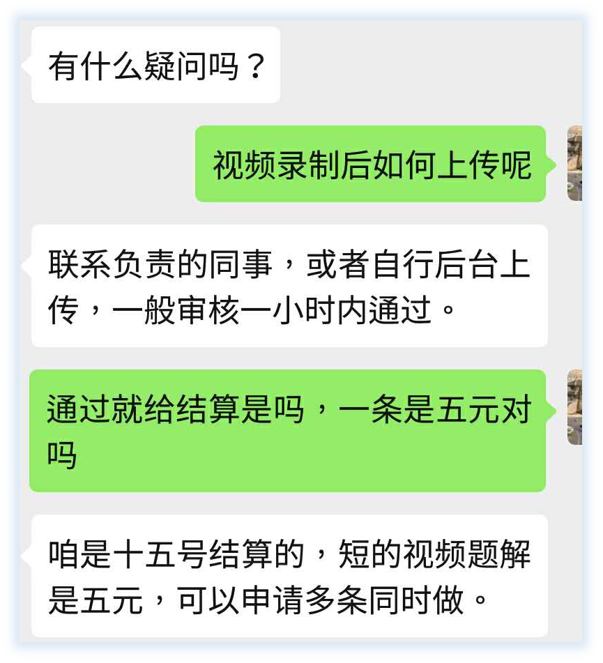 另一家位于宁波的在线教育机构更是开出了超低的薪酬,“大家可以多录些视频,如果通过的话,文科短视频每条5元,理科短视频是6元。”群里一位负责统筹的工作人员如是说。