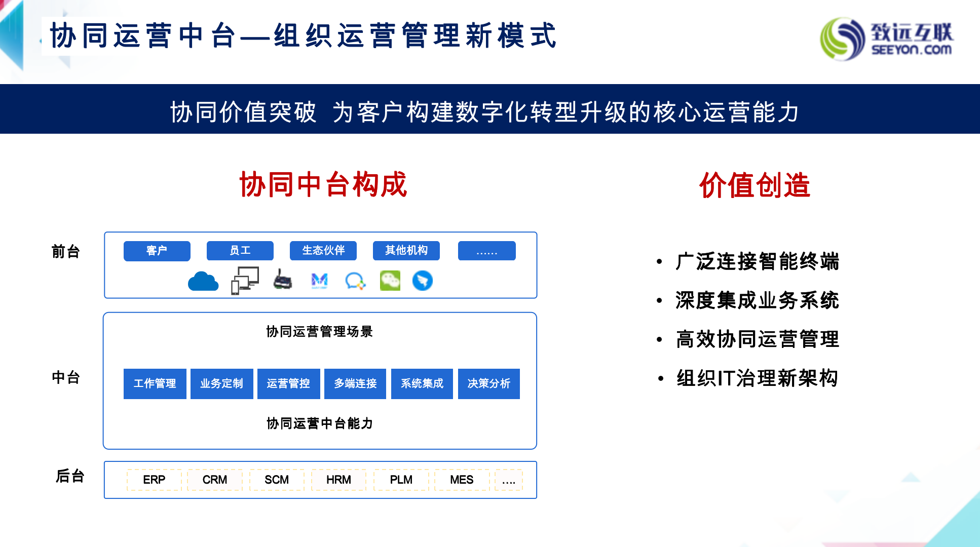 也就是说,协同办公已经从十几年前的单个产品发展成为一个生态系统。对于协同管理软件的认知变化如今也体现在致远互联的产品上:从最初的协同办公,到后来一些业务层的协同业务,再到现在的协同运营中台、协同云,致远互联的角色也在发生蜕变。