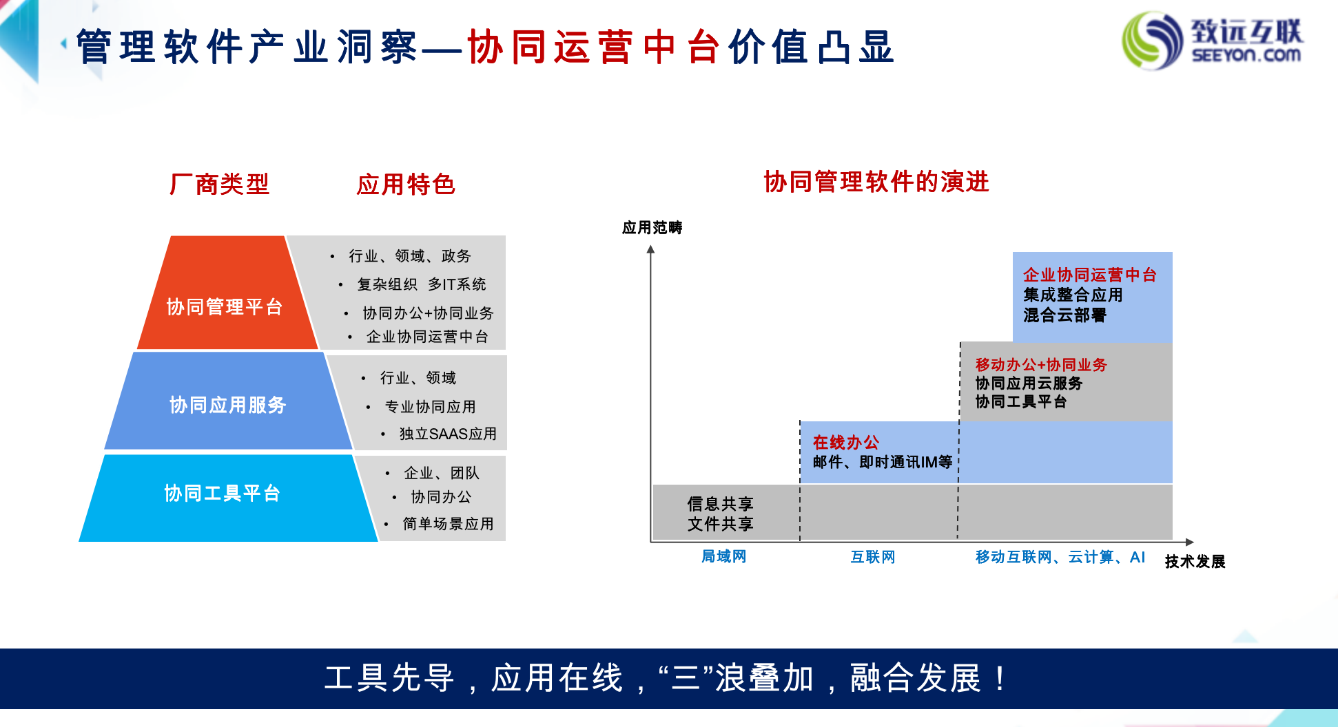 经过近二十年的发展,今天的协同办公已经是一个非常大的概念。致远互联将之分为三个层级:在最前端(用户端)是工具级平台,比如钉钉、企业微信、飞书都属于这一类;在底层,有很多行业或是业务的SaaS应用,比如CRM、HR、BI、项目管理等;而中间,则是协同管理平台即企业中台,针对复杂的组织、多IT系统进行协同运营,这也可以说是企业的数字化底座,数字化运营的基石。“协同管理软件基本形成工具先导、应用在线,协同管理平台‘三’浪叠加,融合发展的格局。”