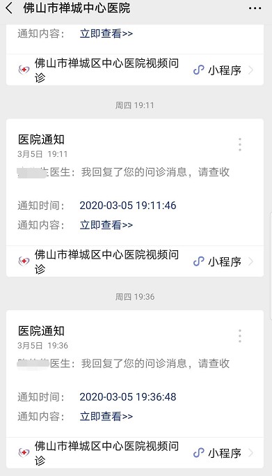 就慢性咽炎问题,懂懂笔记向两位医生进行在线问诊咨询,大约在半个小时后就得到了回复。因为禅医互联网医院使用微信小程序平台,他们的回复第一时间通知到懂懂笔记的微信上。