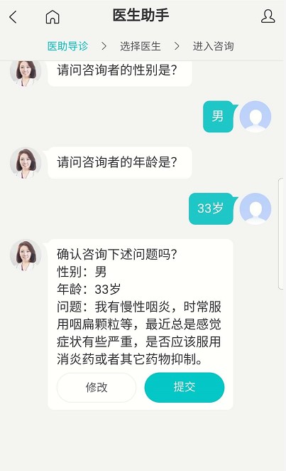 百度健康发挥了其在网络引擎搜索和AI的优势,旗下的拇指医生作为在线轻问诊的用户体验整体感受较好。同时百度AI导医功能强大,医生接诊后不会再询问前期AI导医相关问题,而是直接进入病情诊疗环节。