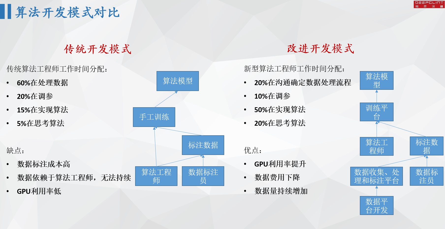 http://si1.go2yd.com/get-image/0f0YfKxDGHQ如上图,在传统的算法开发模式中,工程师把大量的时间都放在处理参数等这些基础工作上,而真正能发挥其价值的时间占比很少。同时,机器的GPU利用率低,硬件无法充分发挥其效能。形成了对人才价值和机器价值的双重浪费。