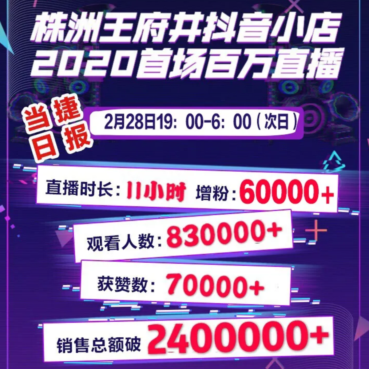 株洲王府井尝试与抖音平台合作,抖音顺应商家的需求推出“护航计划”,给线下商家开辟出绿色通道,1对1运营帮扶,并且给出流量支持,株洲王府井商场实现了“两天开店”的效率。最神奇的是,作为“小店”首秀,在账号只有400粉丝的情况下,直播开场仅1小时,观看人数突破1万,获赞数超10000人次,增粉1.8万。截止到活动结束,观看人数突破83万,获赞数超70000人次,增粉6万,直播时跳转至电商平台销售量超3000件,销售额240万+。