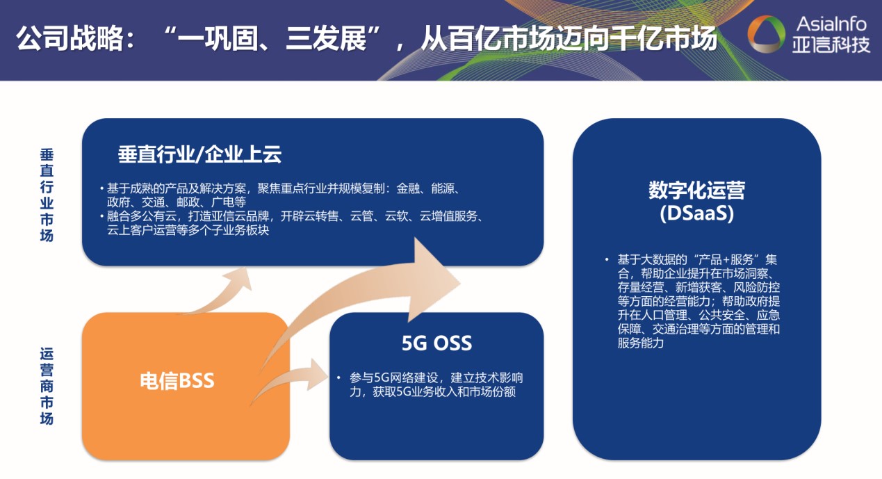 对于亚信科技来说,经过多年在运营商领域的持续深耕,公司在传统的BSS领域发展空间已趋于稳定。今天,从外部看,5G技术浪潮已经为亚信科技打开了新的上升通道;从内部看,亚信科技也希望进入更加广阔的企业上云和数字化运营市场。
