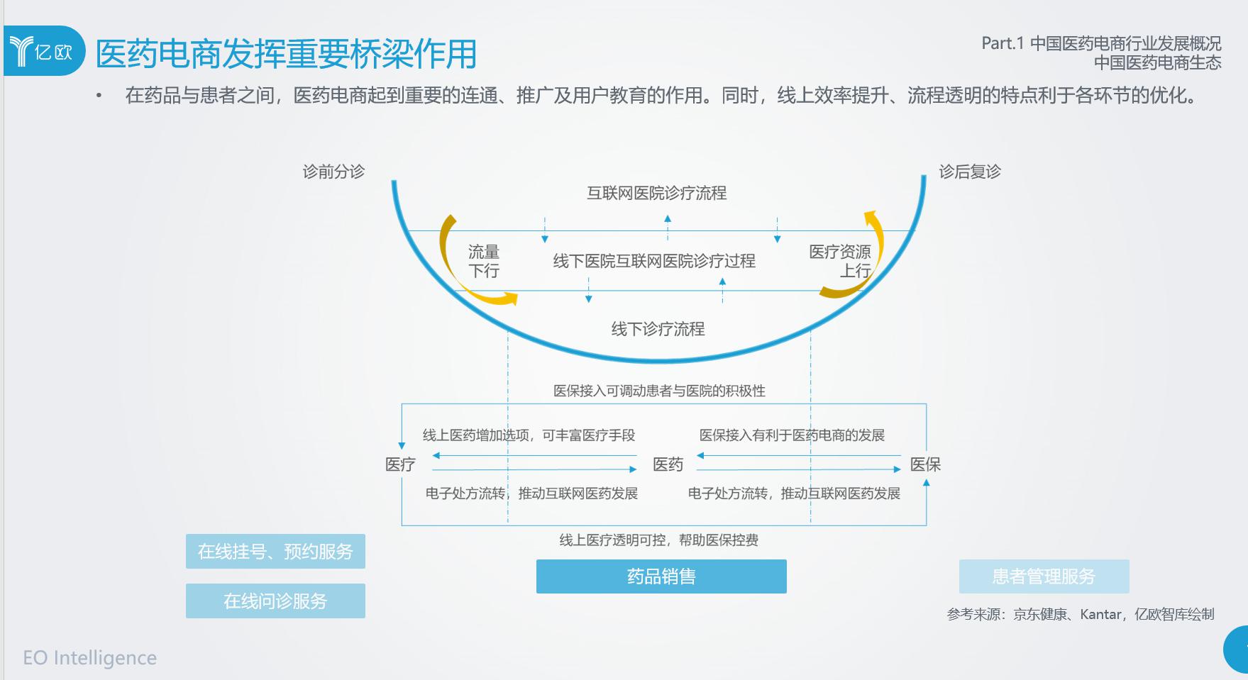 以前,药品的渠道主要分为三类:一是医院,二是连锁药店,三是社区卫生服务机构或诊所。前三种渠道的覆盖度其实都有局限性,药厂需要一个一个开发,一个一个对接,人力物力成本都很高。电商在药品与患者之间起到重要的连通、推广及用户教育的作用。同时,线上效率提升、流程透明的特点利于各环节的优化。以京东大药房为例,发展的四年中一直探索,集成流量、资源、技术、供应链能力,赋能医药产业链。药厂在与京东的合作中,可以分享到京东平台获得营销、大数据、物流的资源,大大提升了渠道的效率。