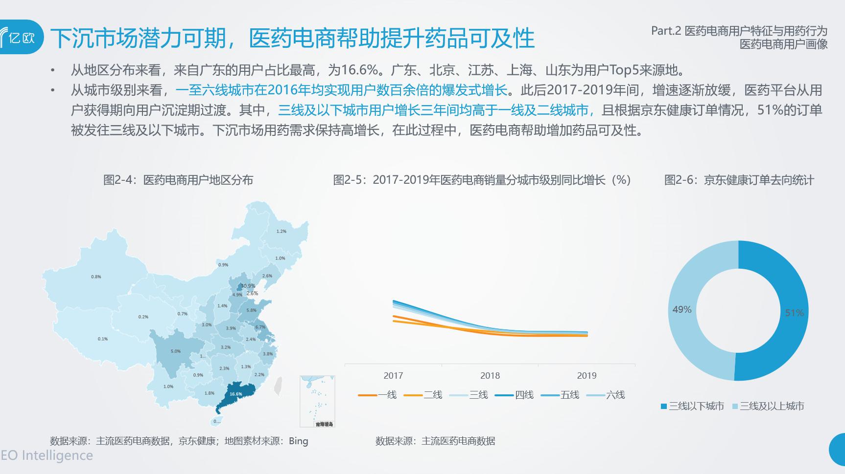 从增量角度看,还有很重要的一点就是电商渠道的覆盖面,很多药厂通过传统的渠道覆盖一二三线城市还可以,但到下沉市场出现了断层。而电商可以帮助他们下探到更广大的四五六线城市。根据京东健康订单情况,51%的订单被发往三线及以下城市。下沉市场用药需求保持高增长,在此过程中,医药电商帮助增加药品可及性。